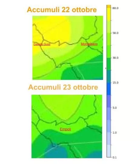 Altrove però le cose hanno preso tutt'altra piega, confermando anche in questo caso la maggiore possibilità in fase previsionale del verificarsi dei fenomeni con una intensità ragguardevole. Vinci arriva a superare i settanta millimetri, ed in questo caso oltre quarantacinque in meno di un'ora nella giornata del 22 ottobre. Ancora peggio Cerreto Guidi, con punte su Stabbia di settantaquattro millimetri, Lazzeretto sessanta, a cui si sono andati ad aggiungere altri quarantacinque millimetri nella giornata del 23 ottobre. A conti fatti Stabbia in meno di quarantotto ore cumula centoventi millimetri, Lazzeretto centocinque. Attorno tutti valori di gran lunga inferiori, in alcuni casi dimezzati in altri addirittura ridotti ad un quarto in un areale di neppure 50 chilometri.