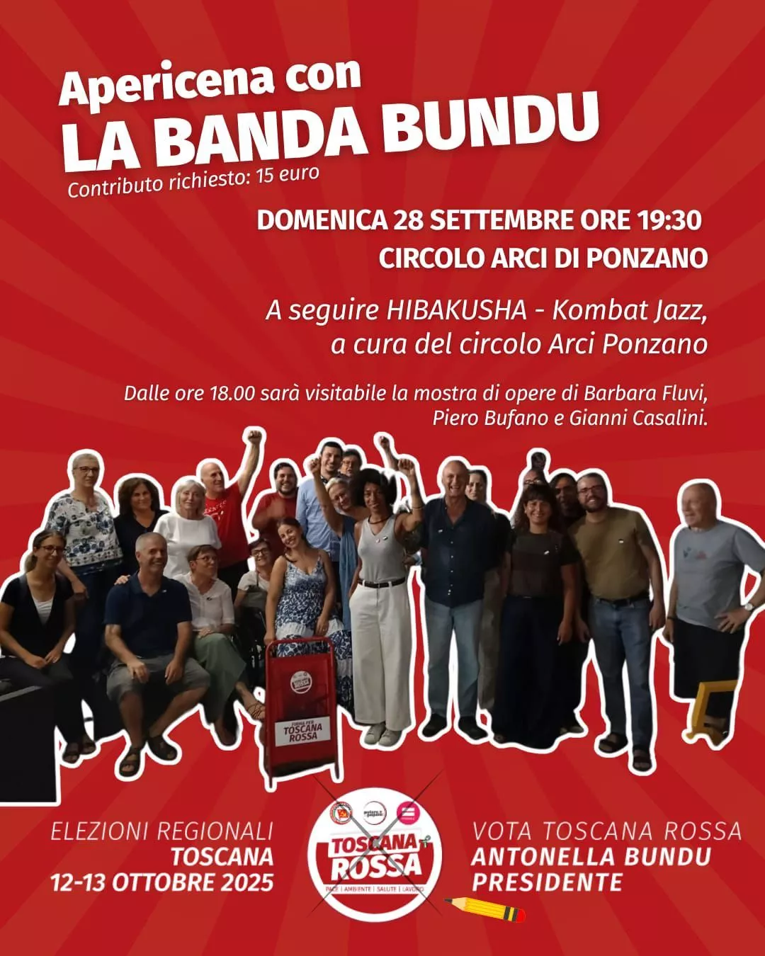 Domenica 28 settembre, dalle 18 alle 24, al circolo ARCI di Ponzano si terrà una serata dedicata a Toscana Rossa, all'insegna della cultura, della socialità e del sostegno al progetto che vede la candidatura di Antonella Bundu a presidente della Regione Toscana. Saranno presenti anche le candidate e i candidati della circoscrizione Empolese Valdelsa.