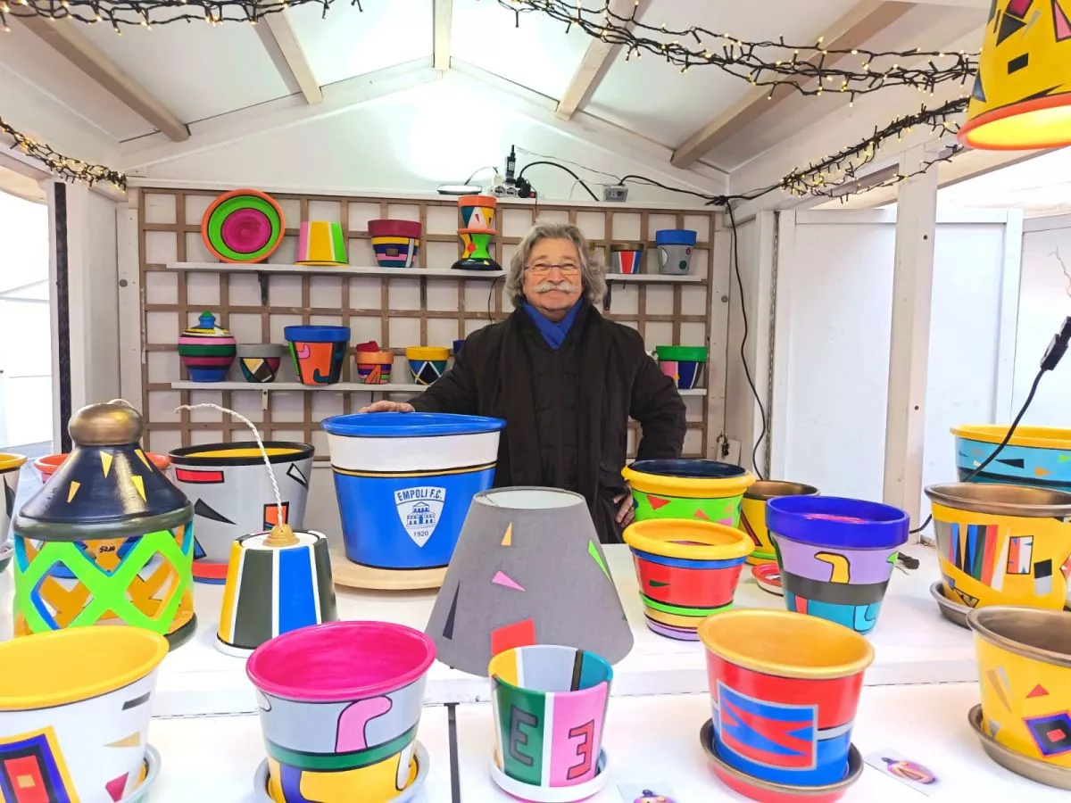 generazioni di empolesi come “Ciubo” — accoglie i visitatori con i suoi vasi dipinti a mano, una vera esplosione di forme e cromie.La sua produzione è una collezione vivace e sorprendente: pezzi unici, decorati con un linguaggio pittorico che mescola geometrie, stili e richiami pop. Accanto ai lavori più artistici, spiccano i vasi dedicati al territorio, come quello ispirato ai colori dell'Empoli F.C., un omaggio alla squadra della città che attira l'occhio e strappa un sorriso ai tifosi di passaggio.