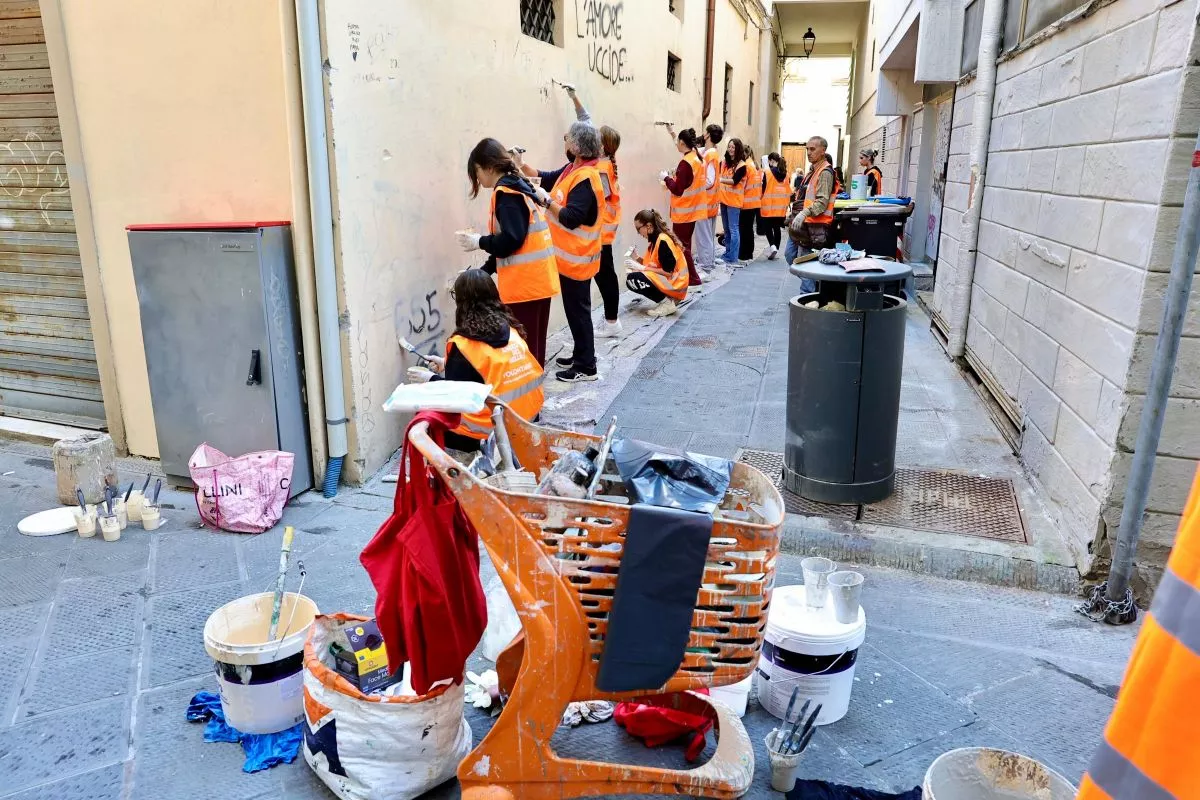 Assieme ai 4 volontari della Fondazione Angeli del Bello di Firenze, dotati di certificazione specifica per intervenire anche su atti vandalici su monumenti gestiti dalla Soprintendenza, erano presenti due classi del liceo artistico e classico dell'IIS 'Virgilio' e due professori ad accompagnarli, per un totale di 25 volontari intenti a rimuovere le scritte dai muri e dagli arredi urbani.
