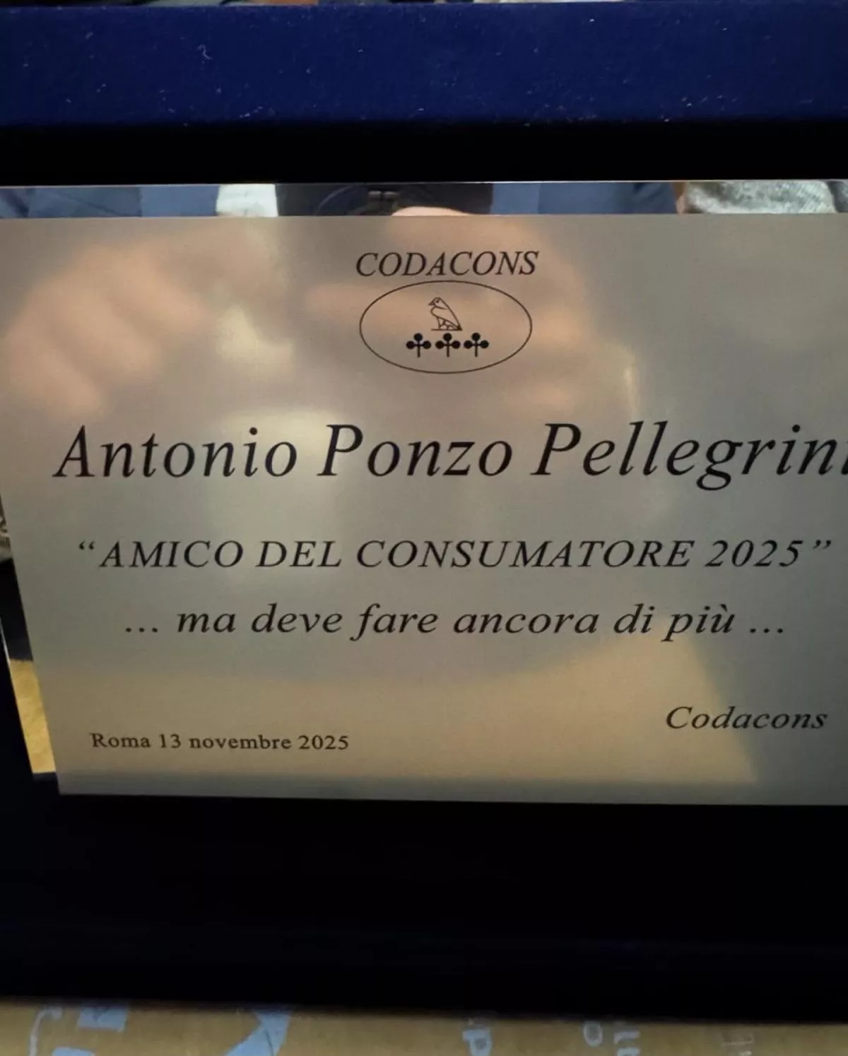 Pellegrini, oggi dirigente in AIGET e Enegan Energy Partner, ha condiviso sui propri canali social un lungo post di riflessione dopo aver ricevuto il premio “Amico del Consumatore 2025”, conferito dal Codacons.“A volte una foto racconta più di mille discorsi – scrive Ponzo Pellegrini –. Quella di oggi, scattata durante la consegna del riconoscimento, ne contiene almeno tre: lo sguardo attento di chi ti osserva, la provocazione intelligente di chi ti mette alla prova e la responsabilità di chi accoglie un premio sapendo che dovrà fare ancora di più”.