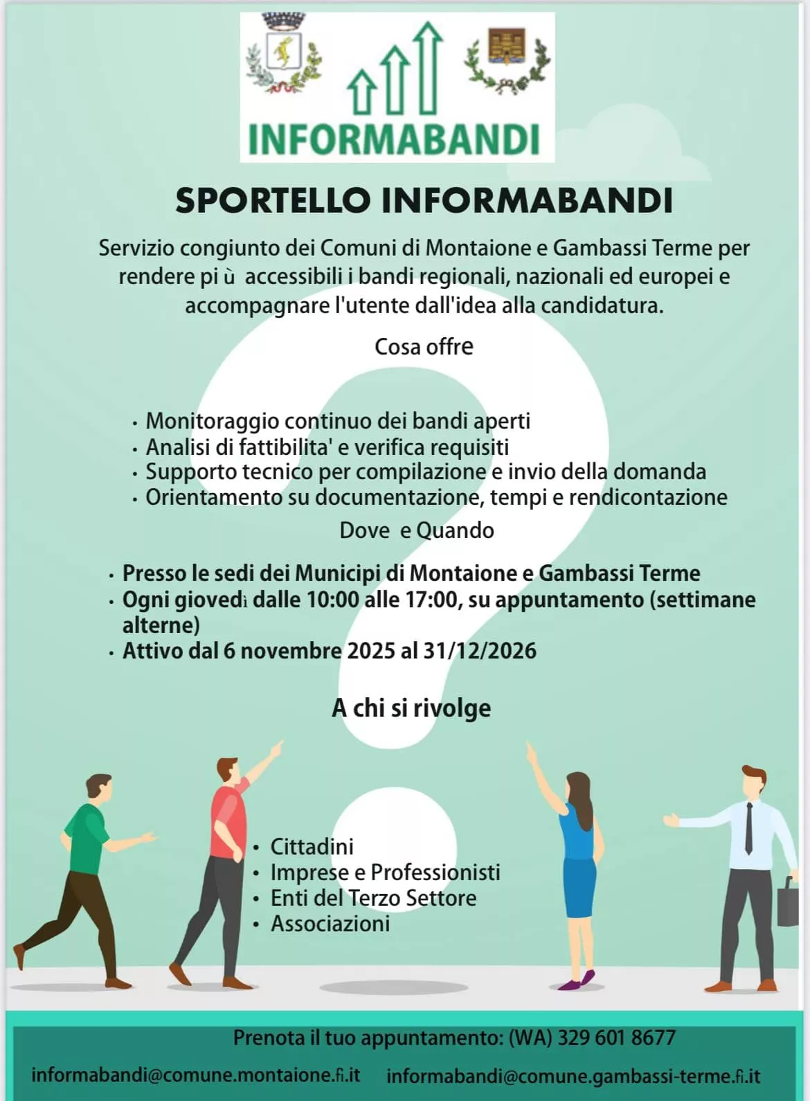 A tre mesi dall'attivazione, Informabandi, il servizio congiunto dei Comuni di Montaione e Gambassi Terme, si dimostra un supporto concreto ed efficace per cittadini, imprese ed enti del territorio interessati a partecipare ai bandi regionali, nazionali ed europei.