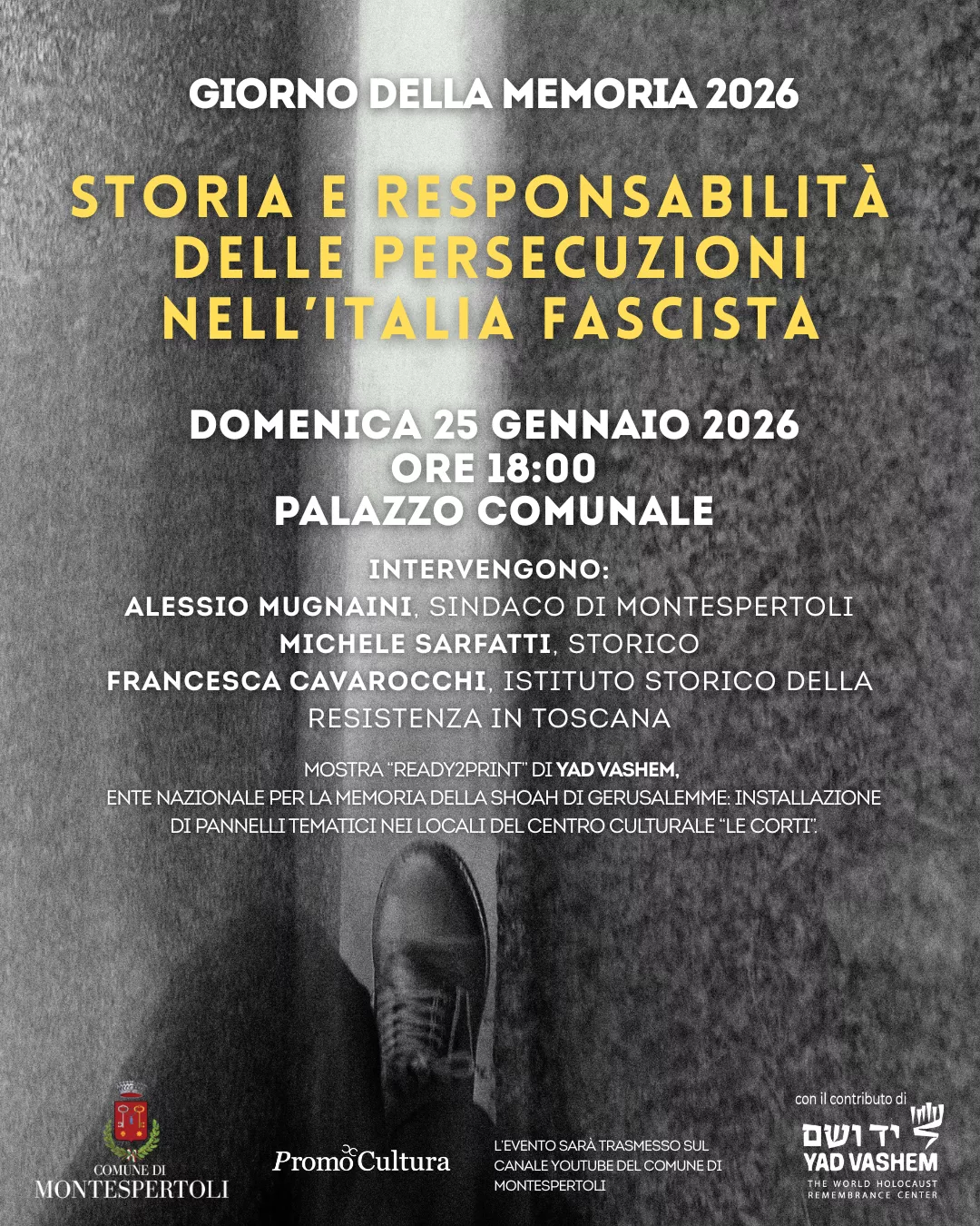 Il Comune di Montespertoli conferma anche quest'anno il suo impegno civile per commemorare il Giorno della Memoria, ricorrenza internazionale dedicata al ricordo delle vittime dell'Olocausto e delle persecuzioni razziali e politiche. L'edizione 2026 si svolgerà domenica 25 gennaio alle ore 18:00 ...