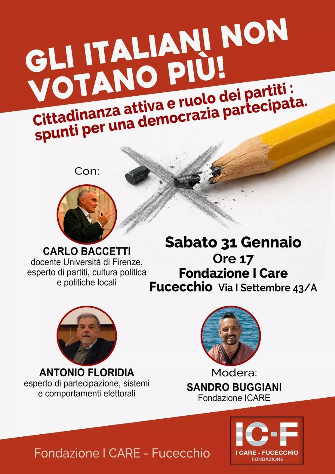 Gli italiani non votano più! È questo il titolo dell'evento che si terrà sabato 31 gennaio alle ore 17:00 alla Fondazione I Care di Fucecchio (stanza a vetri) con Antonio Floridia, esperto di partecipazione, sistemi e comportamenti elettorali e Carlo Baccetti, docente dell'Università di Firenze, ...