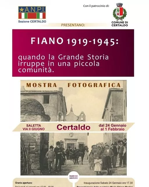 L’ANPI di Certaldo, con il patrocinio del Comune di Certaldo, ripropone la mostra fotografica “Fiano 1919-1945. Quando la Grande Storia irruppe in una piccola comunità”, un’esposizione che raccoglie un’importante selezione di documenti e immagini d’epoca legate alla storia del nostro territorio.