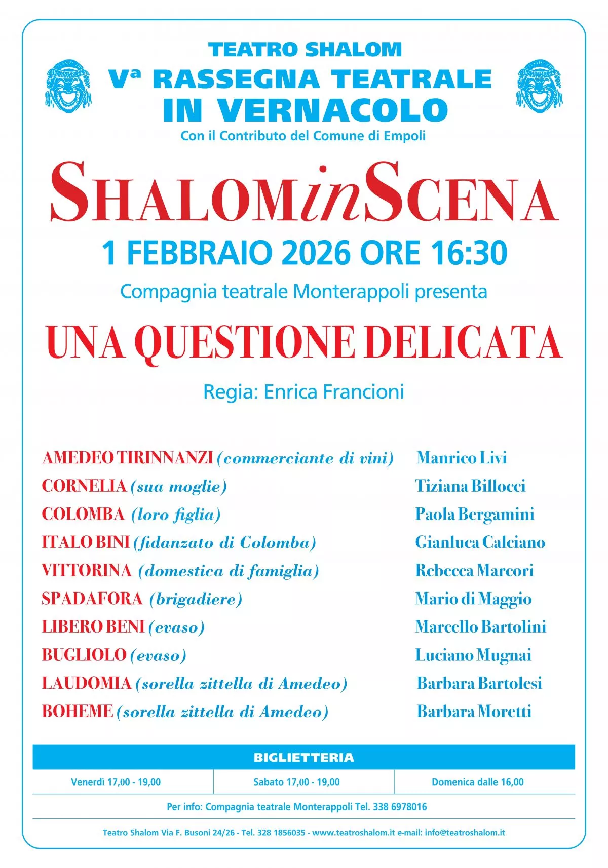 Domenica 1° febbraio 2026, alle ore 16.30, ed eccezionalmente sabato 31 gennaio 2026 alle ore 21,15, avrà luogo il secondo spettacolo della V^ rassegna di vernacolo ShalominScena al Teatro Shalom di Empoli: