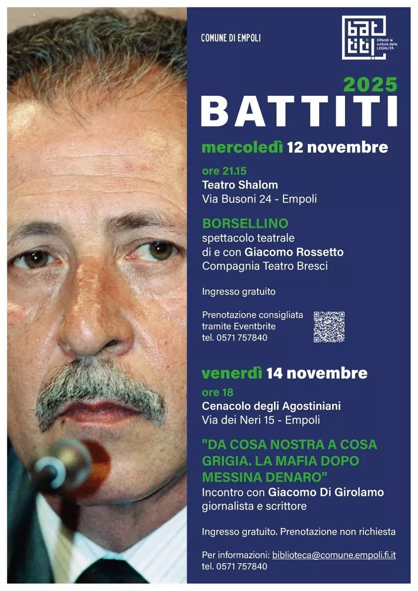 Una settimana dedicata a "Battiti e alla legalità". Nei giorni dal 12 al 14 novembre 2025 il Teatro Shalom (via Busoni 24) e il Cenacolo degli Agostiniani di Empoli (via dei Neri 15) saranno palcoscenico dello spettacolo teatrale "Borsellino" di e con Giacomo Rossetto, Compagnia Teatro Bresci e dell'incontro pubblico con il giornalista e scrittore Giacomo Di Girolamo.