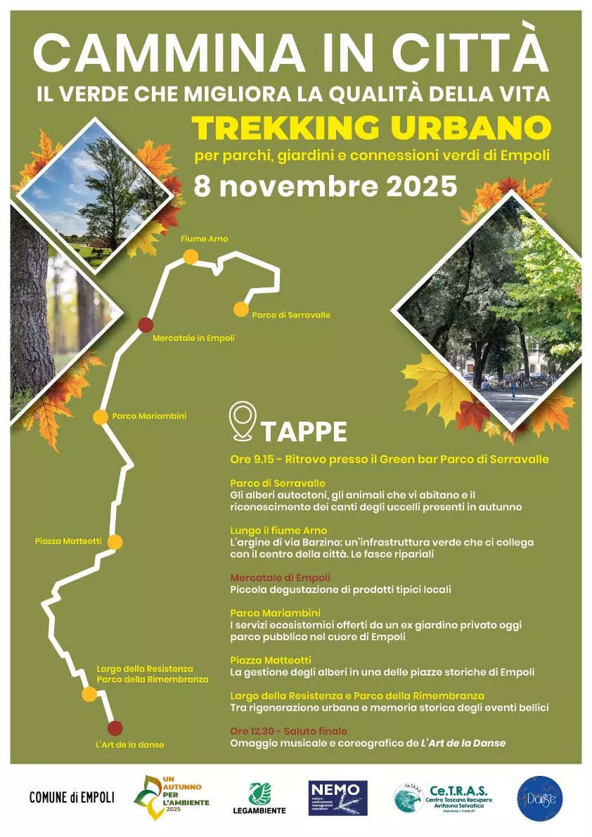 Promuovere la cura e la valorizzazione degli alberi e ricordare il ruolo essenziale dei boschi e del verde urbano per il nostro ecosistema: con questo spirito Empoli anticipa la Giornata Nazionale degli Alberi, che in tutta Italia si celebra il 21 novembre, con una speciale anteprima dedicata alla natura in città. Sabato 8 novembre 2025 alle 9.15, con ritrovo al Green Bar nel parco di Serravalle, prenderà il via “Cammina in città”, un trekking urbano alla scoperta degli alberi e delle piante che popolano parchi e giardini empolesi. L’iniziativa, organizzata dal Comune di Empoli nell’ambito del cartellone “Un Autunno per l’Ambiente” e in collaborazione con Legambiente Circolo Empolese Valdelsa, NEMO, Ce.T.R.A.S. di Empoli, la scuola Art de la Danse e il Mercatale, vuole essere un’occasione conviviale e rigenerante per riscoprire la città attraverso il contatto diretto con la natura, lasciando per qualche ora da parte lo smartphone e privilegiando “altre connessioni”: quelle con il paesaggio, con i sapori locali e con l’arte. Il percorso inizierà nel parco di Serravalle, dove i partecipanti potranno osservare alberi autoctoni e ascoltare il canto degli uccelli, per poi proseguire lungo il fiume Arno, tra fasce ripariali e nuove infrastrutture verdi che collegano il centro urbano. La seconda tappa sarà dedicata al gusto con una sosta al Mercatale in via Bisarnella, dove si potranno assaggiare i prodotti tipici locali e conoscere meglio i produttori del territorio. Dopo la degustazione, la camminata continuerà verso il parco Mariambini, esempio di rigenerazione di un ex giardino privato diventato oggi spazio pubblico nel cuore della città, per poi fare tappa in piazza Matteotti, dove si parlerà della gestione arborea dei “Giardini di Empoli”. L’ultima parte del percorso porterà al Largo della Resistenza e al Parco della Rimembranza, luoghi simbolo di memoria e rinascita urbana. Qui, alle 12.30, la mattinata si concluderà con un omaggio musicale e coreografico curato dalla scuola Art de la Danse. L’assessora alla Transizione ecologica del Comune di Empoli ha descritto l’iniziativa come una “prefesta dell’albero” da vivere nei parchi e nei giardini cittadini, un modo per andare oltre il semplice svago e scoprire la ricchezza vegetale e ambientale che caratterizza Empoli. Camminando insieme – ha sottolineato – si potrà imparare a riconoscere le piante che migliorano ogni giorno la qualità della vita e scoprire i risultati dei progetti di riqualificazione urbana, come quelli del parco Mariambini e del parco della Rimembranza, oltre ai prossimi interventi previsti in piazza Matteotti. In vista della Giornata Nazionale degli Alberi del 21 novembre, istituita dalla Legge n. 10 del 2013, l’assessora ha inoltre ricordato l’impegno dell’amministrazione a donare ogni anno due alberi da frutto alle scuole dell’infanzia del territorio, per un totale di dieci alberi entro la fine del mandato. Quest’anno gli alberi saranno destinati alle scuole “Valgardena” e “Peter Pan”, quest’ultima protagonista di una bella iniziativa: la messa a dimora dell’albero in un’area pubblica, in Largo della Resistenza, così che bambine, bambini e famiglie possano seguirne la crescita nel tempo. Empoli, ancora una volta, sceglie di camminare nel segno del verde, della consapevolezza ambientale e della comunità.