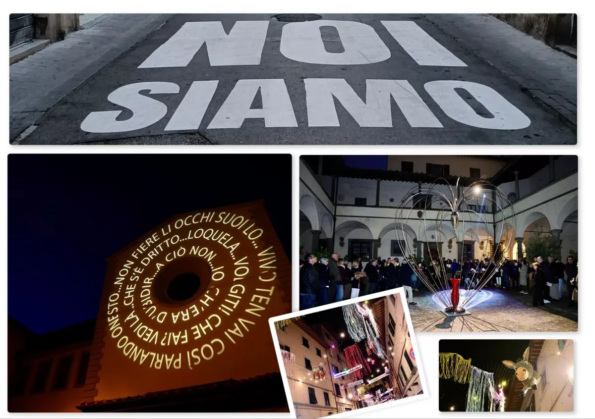 L'opera prosegue in alto, tra le luci e i fili che attraversano la via: teli e frasi del Manifesto Noi Siamo, sonagli di bambù che risuonano al vento, e un'atmosfera sospesa che invita alla riflessione sulla connessione tra individuo, natura e comunità.