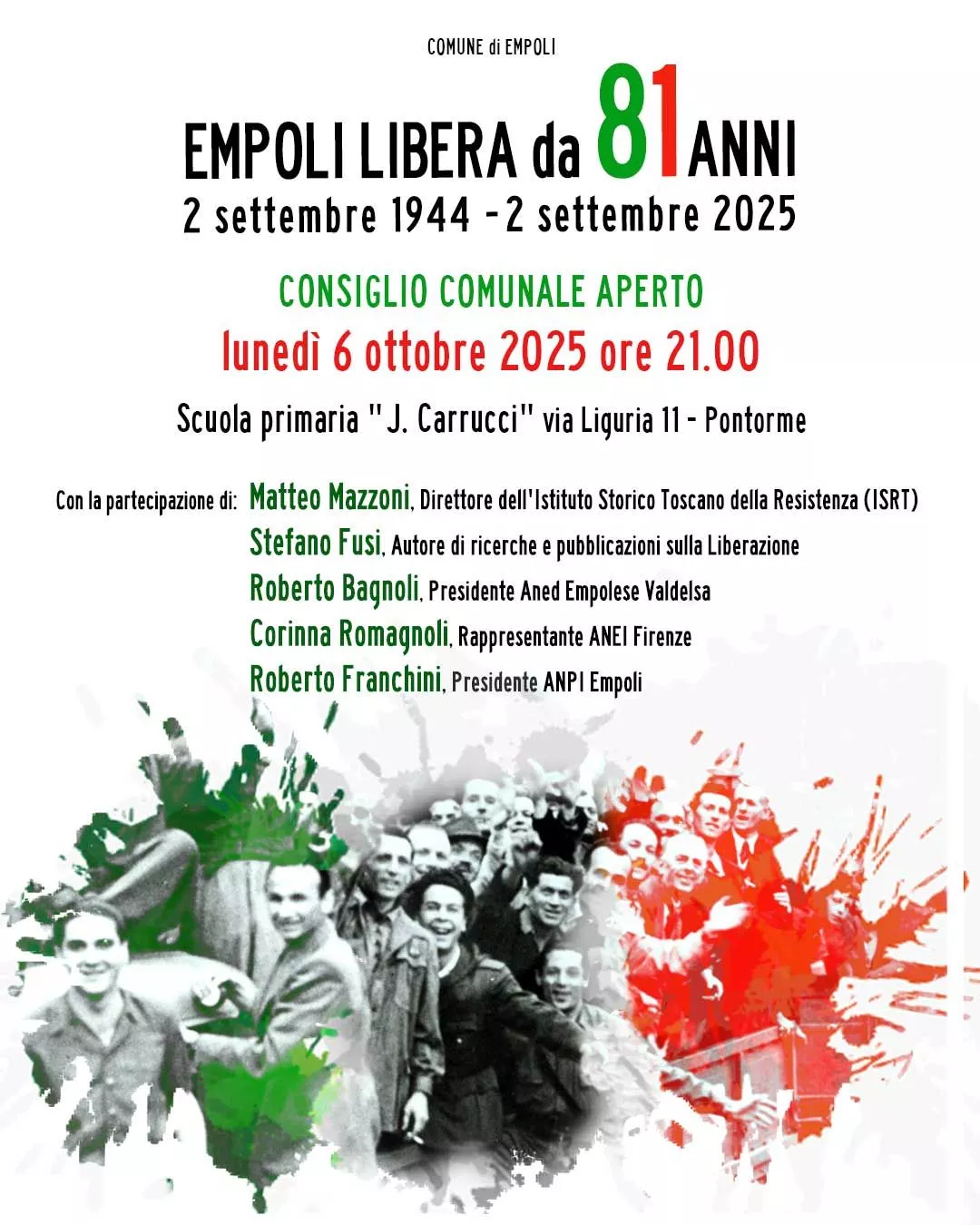 Per l'occasione interverranno il sindaco del Comune di Empoli, la presidente del Consiglio comunale, i gruppi consiliari con un contributo ciascuno e alcuni ospiti quali: Matteo Mazzoni, direttore dell'Istituto Storico Toscano della Resistenza (ISRT); Stefano Fusi, autore di ricerche e pubblicazioni sulla Liberazione; Roberto Bagnoli, presidente ANED Empolese Valdelsa; Corinna Romagnoli, rappresentante ANEI Firenze (Associazione Nazionale Ex Internati militari) e Roberto Franchini, presidente ANPI Empoli.