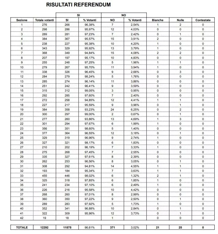 Come prevedibile, tra chi ha votato, il consenso per il Sì è stato quasi unanime: 96,61% (11.875 voti), contro un 3,02% di No (371 voti), con 21 schede bianche e 25 nulle. L'astensione ha rappresentato, di fatto, un “No silenzioso”, o meglio una forma di opposizione implicita che ha evitato di validare la consultazione e far pesare l'abrogazione.