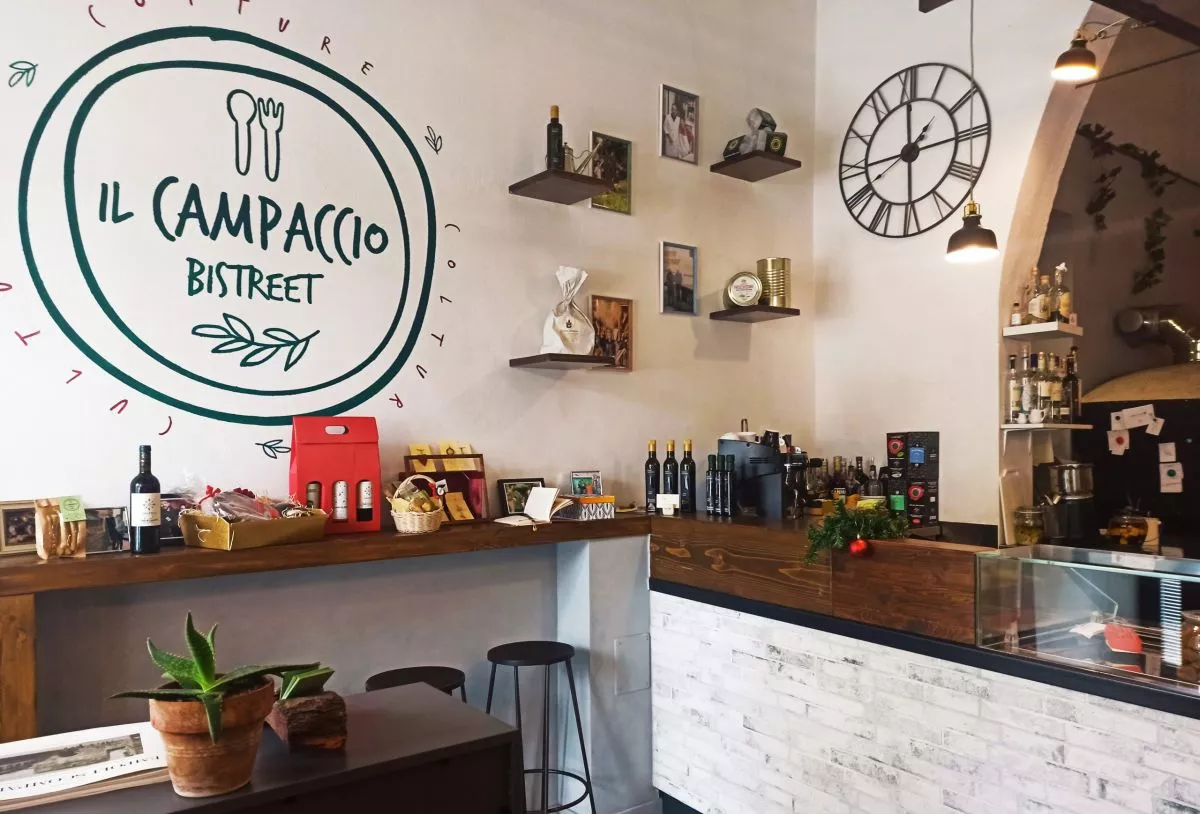 giovani per un locale che vuole rappresentare una cucina ed un servizio vivaci ed attenti ad alcuni punti fermi della qualità. Il nome, seppure legato alla storia del luogo, richiama qualcosa di non piacevole, cioè un posto dove lavorare faticosamente la terra, anche se la definizione completa è bistreet che si può intendere come bistrot, aspirazione forse del locale.Il locale è comunque accogliente e curato, lontano dai rumori della trafficata via Curtatone (ci sono anche alcuni tavoli all’esterno utilizzabili in stagione). La forza della proposta del Campaccio è l’offerta molto variegata che consente di mangiare la pizza sempre a cena e a pranzo il mercoledì ed il venerdì, di avere proposte per pranzo con menù fisso (classico o completo) ad un prezzo molto accessibile.
