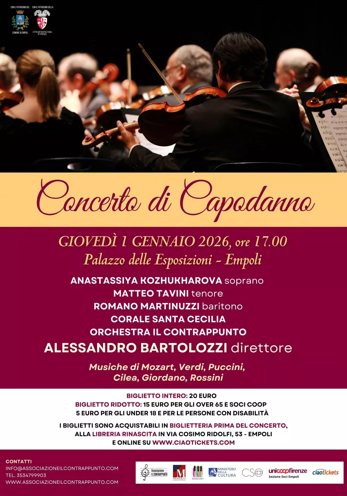 L'Associazione Il Contrappunto di Empoli in collaborazione con l'Associazione Culturale Mosaico inaugura il nuovo anno con uno degli appuntamenti più attesi e amati dal pubblico empolese: il Concerto di Capodanno, giunto alla sua quarta edizione. Giovedì 1 gennaio 2026, alle ore 17, il Palazzo delle Esposizioni si vestirà a festa trasformandosi in un elegante salotto musicale per accogliere l'Orchestra Il Contrappunto insieme alle voci del soprano Anastassiya Kozukharova, del tenore Matteo Tavini e del baritono Romano Martinuzzi, affiancati dalla Corale Santa Cecilia.