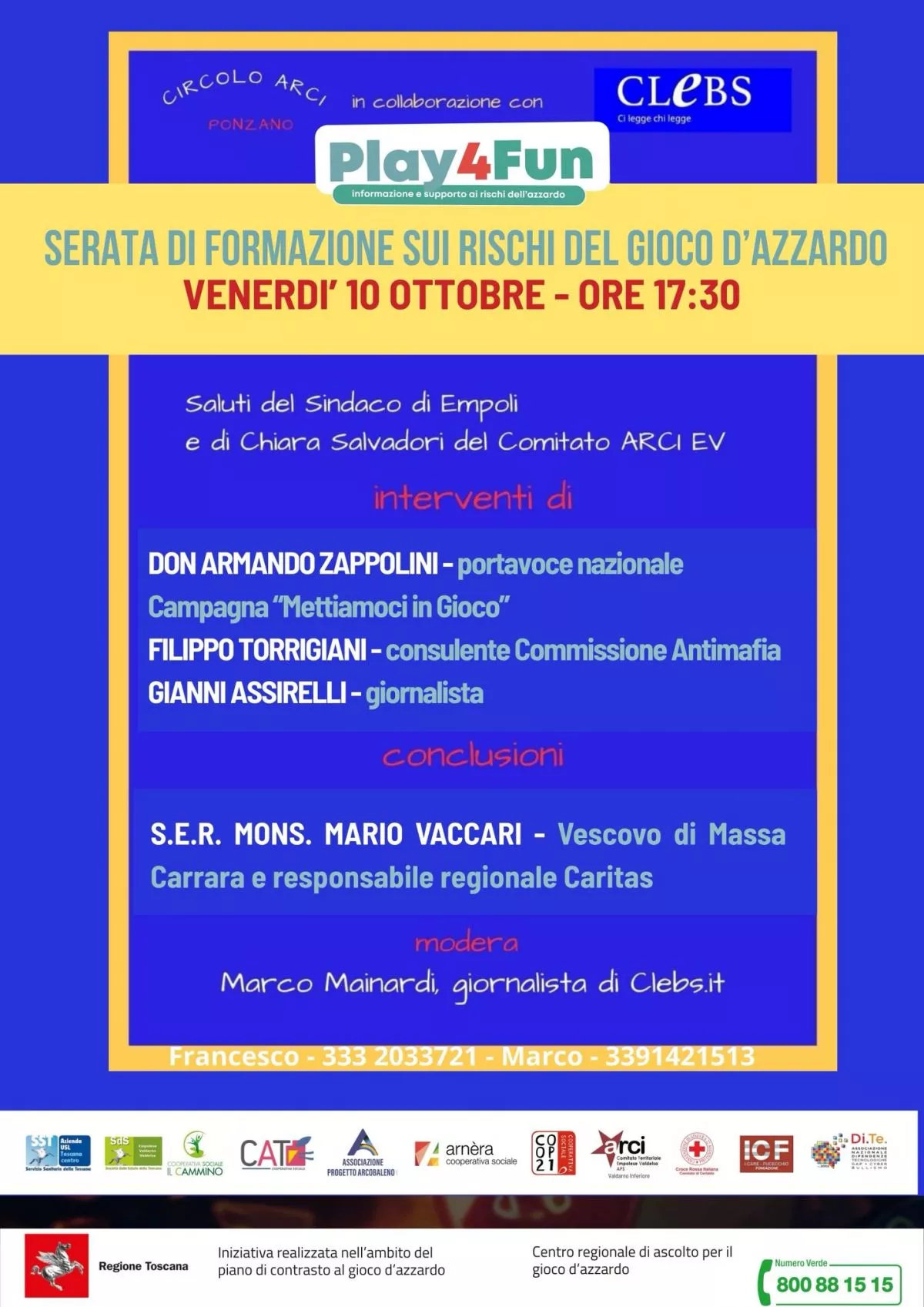 Venerdì 10 ottobre alle 17.30, il circolo Arci di Ponzano in collaborazione con clebs.it organizza una serata di formazione sui rischi del gioco d'azzardo.