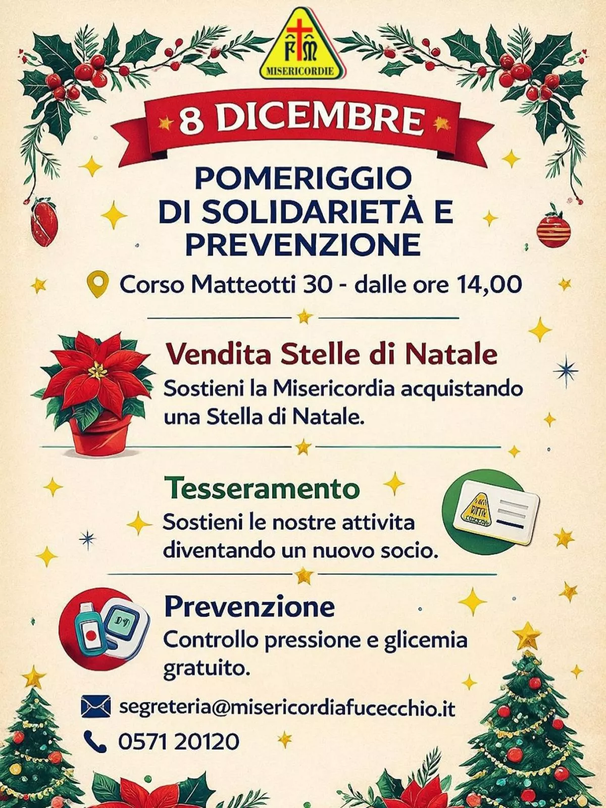 Un altra importante iniziativa da parte della Misericordia di Fucecchio è in programma lunedì 8 dicembre. Presso la sede in corso Matteotti 30 a partire dalle 14.00 gli operatori sanitari e volontari sono a disposizione per un pomeriggio dedicato alla comunità. E' possibile per tutti i cittadini sottoporsi gratuitamente alla misurazione della pressione arteriosa e della glicemia. Saranno inoltre distribuite Stelle di Natale per sostenere l'associazione e nel contempo sarà possibile rinnovare la tessera sociale per entrare a far parte del sodalizio. Saranno inoltre fornite informazioni relative allo svolgimento del servizio civile e del volontariato presso la sede locale nonché riguardo a tutte le attività svolte. L'associazione informa inoltre che: Anche quest’anno Babbo Natale arriva… a domicilio!”