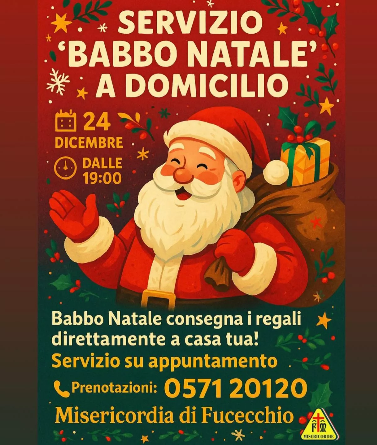 “La sera del 24 dicembre a partire dalle 19:00 Babbo Natale passerà direttamente a casa vostra per consegnare i regali ai più piccoli (e non solo!). Un servizio speciale, prenotabile su appuntamento al numero 0571 20120, che l'associazione dedica alle famiglie di Fucecchio per vivere insieme la magia del Natale.