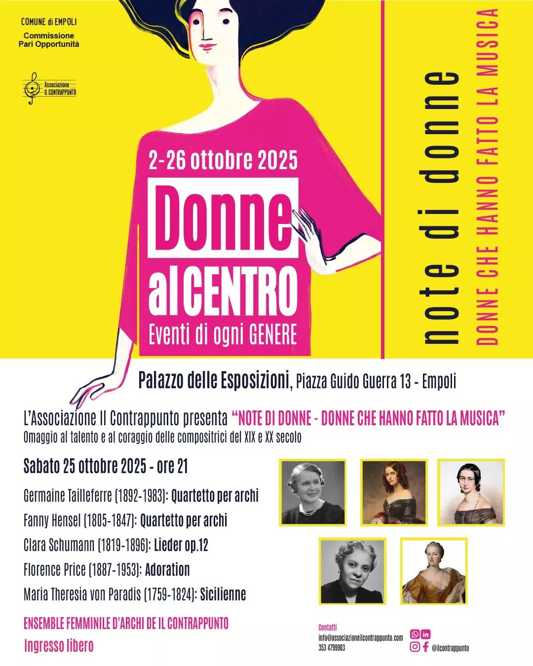 Il 25 ottobre alle 21, al Palazzo delle Esposizioni di Empoli, andrà in scena “Note di donne – Donne che hanno fatto la musica”, un concerto omaggio al coraggio di cinque compositrici che hanno fatto la storia della musica sfidando i pregiudizi del loro tempo. Donne di talento che attraverso la loro perseveranza hanno lasciato un segno nel mondo della composizione proprio negli anni in cui il ruolo della donna nell'arte era relegato ai margini.