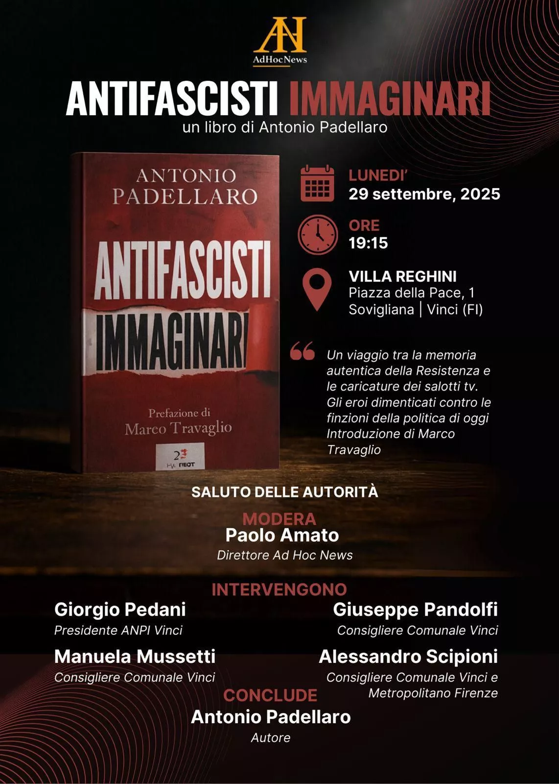 Stasera alle ore 19:15 presso Villa Reghini (Piazza della Pace, 1, Sovigliana), si terrà la presentazione del libro "Antifascisti Immaginari" di Antonio Padellaro, con prefazione di Marco Travaglio. L'evento, organizzato da Ad Hoc News, promette di essere un momento di profonda riflessione sulla ...
