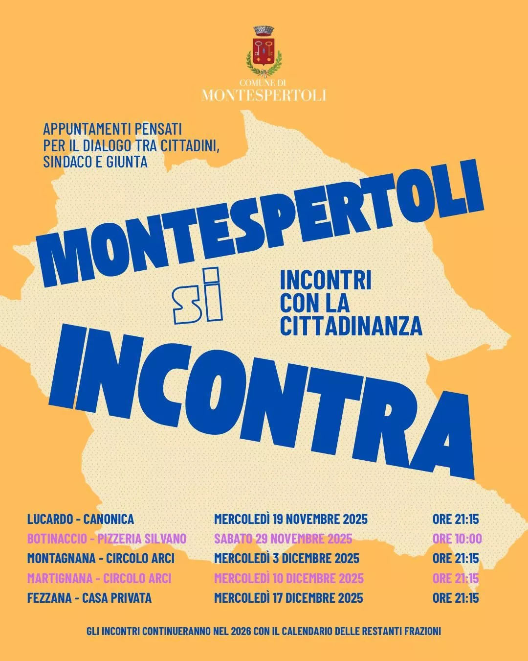 A partire dal 19 novembre al 17 dicembre 2025, Montespertoli torna ad incontrare le sue comunità locali con un calendario di appuntamenti pubblici nelle frazioni. Cinque serate – e una mattina – dedicate al confronto aperto tra cittadini, sindaco e giunta, ospitate nei luoghi di riferimento delle diverse località: Lucardo, Botinaccio, Montagnana, Martignana e Fezzana.