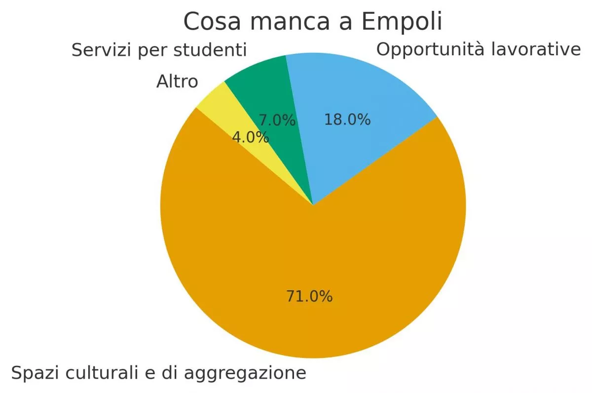 Alla domanda “Ti immagini a Empoli tra dieci anni?”, il 62% degli intervistati ha risposto di sì. Ma dietro quella percentuale si nasconde una condizione: “Solo se la città cambierà”. Un quarto del campione (25%) dichiara invece di voler partire, mentre il restante 13% è incerto. Cultura e socialità, il tallone d'Achille Per il 71% dei giovani la vera urgenza della città è avere luoghi di incontro, spazi gratuiti dove vivere la cultura e la socialità.