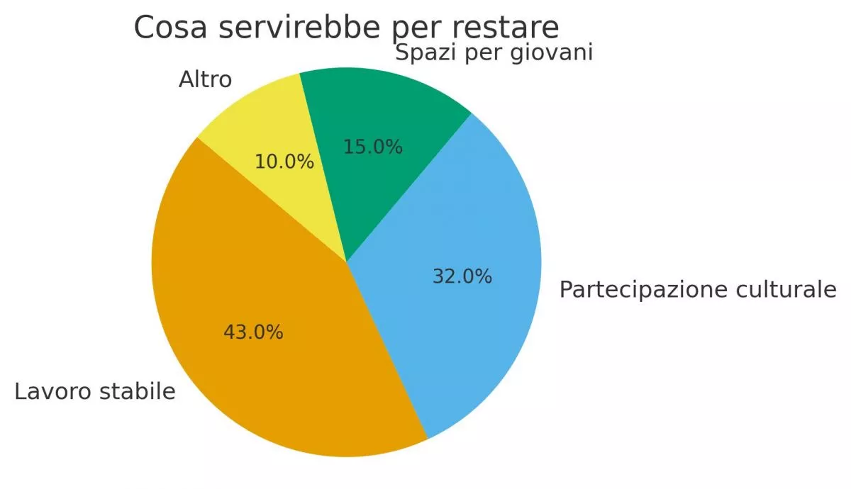 Quando si chiede cosa spingerebbe i ragazzi a rimanere, la risposta è netta: il lavoro. Il 43% sogna un'occupazione stabile e coerente con il proprio percorso di studi. Ma non solo: il 32% individua nella partecipazione culturale e civica il vero motore del cambiamento, mentre un altro 15% chiede spazi condivisi, luoghi dove unire formazione e creatività.