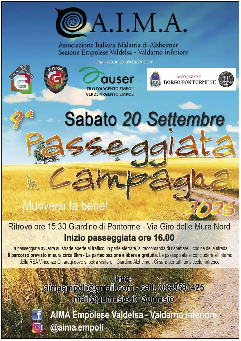 AIMA, Associazione Italiana Malattia di Alzheimer, assieme a Gumasio all'Associazione Borgo Pontormese, organizza per oggi sabato 20 settembre la consueta passeggiata in campagna, un'occasione per godere del verde e trascorrere un pomeriggio all'aria aperta. Il ritrovo è fissato alle ore 15:30 presso il Giardino di Pontorme, in Via Giro della Mura Nord a Empoli. La partecipazione è gratuita e aperta a tutti coloro che desiderano partecipare. Il percorso, lungo circa 6 chilometri, si concluderà presso la RSA Vincenzo Chiarugi, dove sarà offerto un piccolo rinfresco a tutti i partecipanti.
