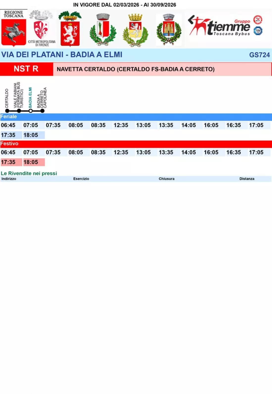 Le fermate previste, valide in entrambe le direzioni di marcia, saranno quelle già esistenti del trasporto pubblico locale, opportunamente segnalate. In particolare, la navetta effettuerà fermata in via della Costituzione 8B a Badia a Cerreto, in via dei Platani a Badia a Elmi, in viale Fabiani nei pressi della farmacia a Certaldo e in viale Matteotti, in prossimità della stazione ferroviaria.