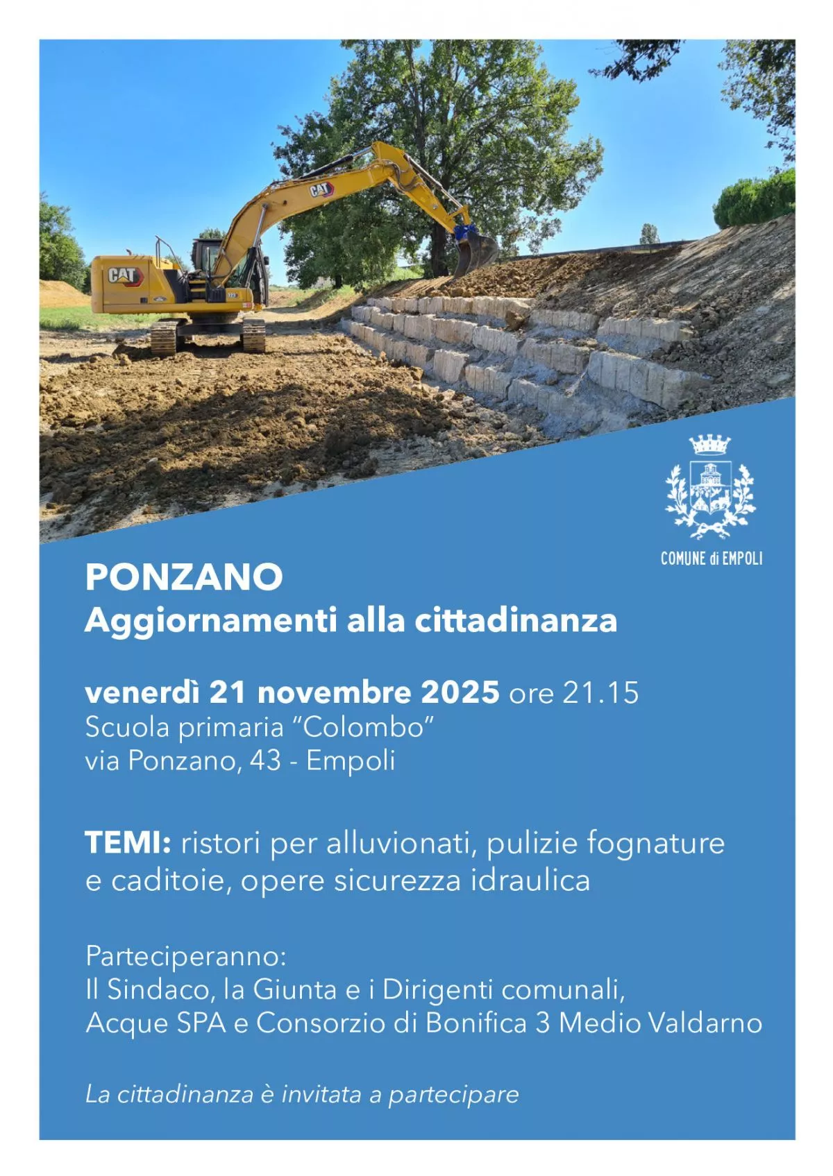 Venerdì 21 novembre, alle ore 21.15, presso la scuola primaria "Colombo" di Ponzano (via Ponzano, 43), si terrà un'importante assemblea pubblica con l’obiettivo di fare il punto sui temi legati alla sicurezza idraulica e alla protezione civile a distanza di sette mesi dagli eventi alluvionali che hanno colpito il nostro territorio. Saranno presenti il sindaco Alessio Mantellassi, i membri della giunta, i dirigenti comunali e i tecnici di Acque Spa e del Consorzio di Bonifica 3 Medio Valdarno, che forniranno gli ultimi aggiornamenti sui lavori in corso e sulle misure di ristoro previste per le famiglie danneggiate. Durante l’incontro verranno approfonditi i temi relativi alla pulizia delle fognature, al monitoraggio delle caditoie e alle opere di sicurezza idraulica.