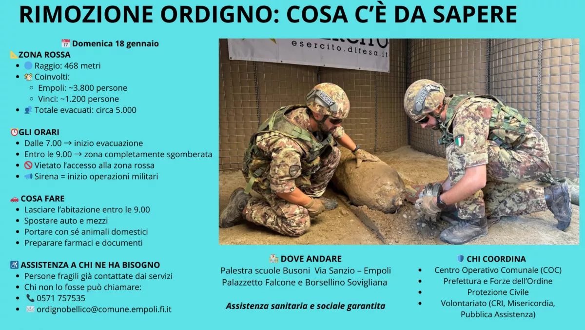 La zona rossa e i numeri dell'operazioneLa zona rossa avrà un raggio di 468 metri dal punto in cui si trova l'ordigno. Coinvolgerà circa 3.800 residenti nel Comune di Empoli e 1.200 nel Comune di Vinci, con lo stesso perimetro e le stesse strade già interessate a settembre. L'elenco dettagliato delle vie e dei numeri civici è consultabile sui siti istituzionali dei due Comuni.