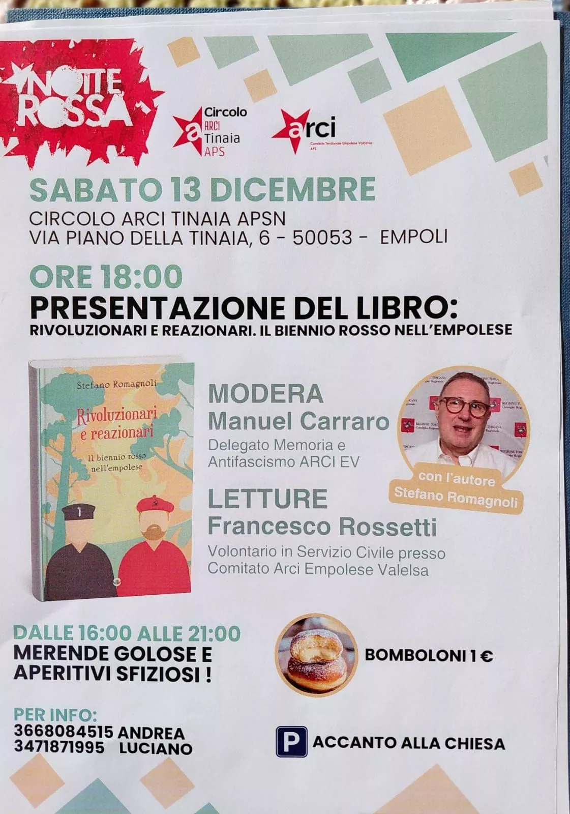 Alla Tinaia è in programma un pomeriggio di festa per la riapertura della strada che costeggia l'Arno dopo i lavori. L'appuntamento è sabato prossimo, 13 dicembre, alle ore 16 con merenda a base di pizze, panini, bomboloncini e ricciarelli. A seguire, alle ore 18, la presentazione del libro di Stefano Romagnoli 'Rivoluzionari e reazionari'