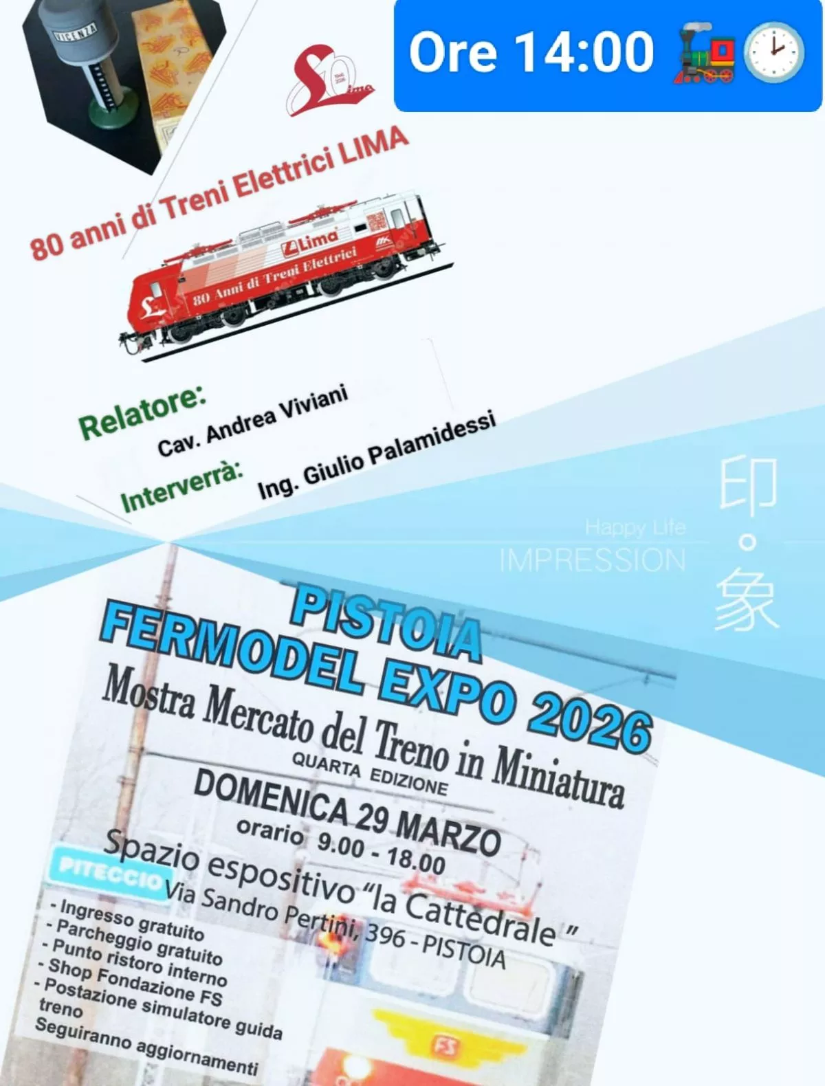 La domenica successiva altro importante appuntamento per il presidente dell'associazione, cavalier Andrea Viviani, che interverrà al Pistoia Fermodel expo, mostra mercato del treno in miniatura, per parlare degli '80 anni dei treni elettrici Lima'. Assieme a lui interverrà l'ingegner Giulio Palamidessi.