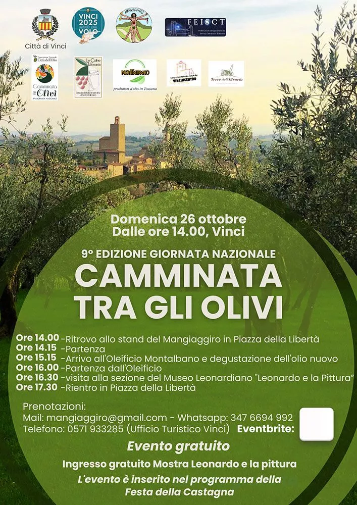 Nell'ambito della Festa della castagna, in programma domenica 26 ottobre a Vinci, la 9ª edizione della Giornata nazionale della Camminata tra gli olivi, la manifestazione è ideata appositamente per esaltare il prodotto di stagione, ovvero l'olio novo, oltre che per godere del paesaggio autunnale leonardiano.