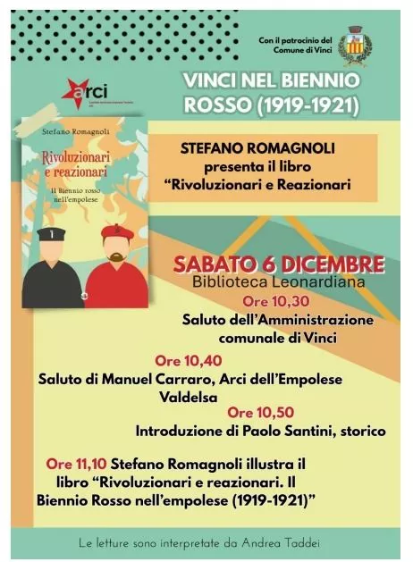 Sabato 6 dicembre 2025, alle ore 10.30, la Biblioteca Leonardiana ospiterà una presentazione che promette di riportare alla luce uno dei passaggi più intensi e drammatici della storia italiana. Lo storico Paolo Santini, l’autore Stefano Romagnoli e il lettore Andrea Taddei introdurranno al pubblico un nuovo volume dedicato al Biennio rosso (1919-1920), due anni che segnarono profondamente non solo il Paese, ma anche la comunità di Vinci e i comuni dell’area empolese.