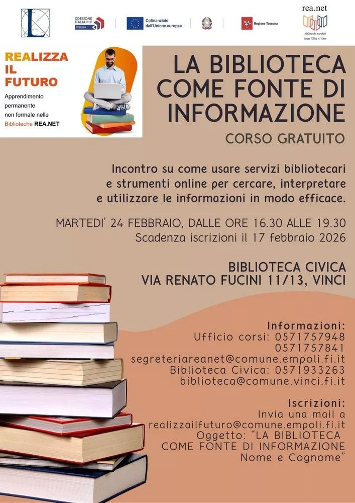 Per informazioni sui corsi, che sono tutti gratuiti, si può chiamare l'ufficio corsi della segreteria REA.net allo 0571757948 o 0571757841, scrivere a segreteriareanet@comune.empoli.fi.it, o ancora chiamare la Biblioteca civica di Vinci allo 0571933263 oppure scrivere a biblioteca@comune.vinci.fi.it.